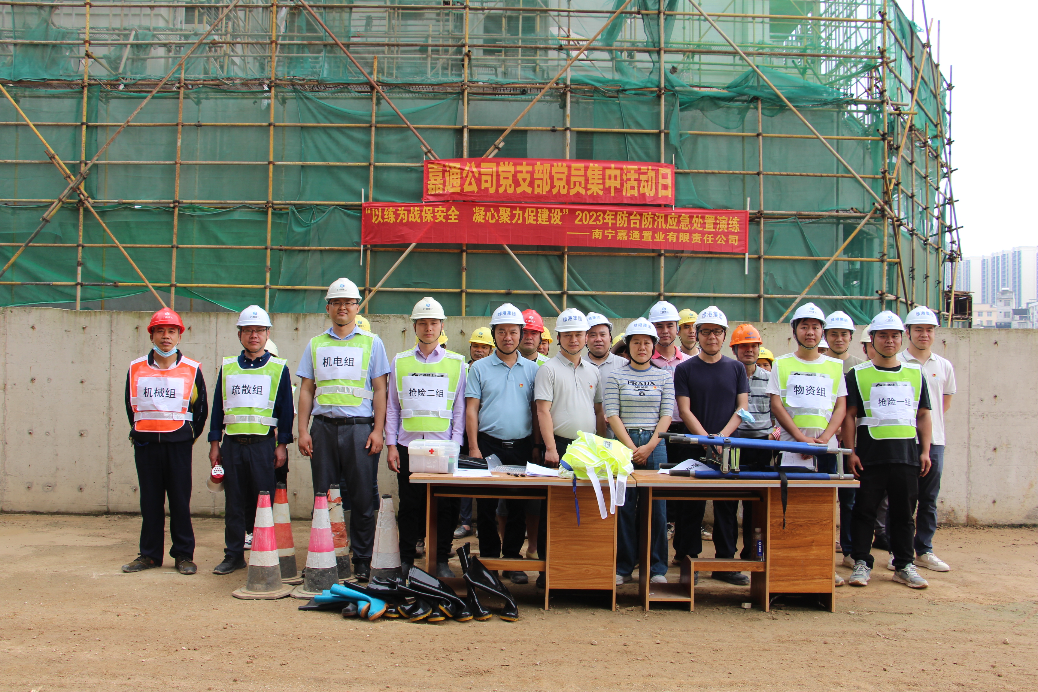 為進(jìn)一步提升項(xiàng)目管理人員應(yīng)對(duì)汛情的應(yīng)急處置能力,提高員工防臺(tái)防汛的安全意識(shí),保障項(xiàng)目現(xiàn)場(chǎng)的設(shè)備和人身財(cái)產(chǎn)安全,4月19日,嘉通公司聯(lián)合施工單位廣西建工第一建筑工程集團(tuán)有限公司在綠港·尚尊一品項(xiàng)目現(xiàn)場(chǎng)開(kāi)展“以練為戰(zhàn)保安全 凝心聚力促建設(shè)”2023年防臺(tái)防汛應(yīng)急處置演練,全面筑牢安全生產(chǎn)防線(xiàn)。綠港集團(tuán)安全監(jiān)督部、項(xiàng)目負(fù)責(zé)人、業(yè)主代表及一線(xiàn)施工人員約30人參加本次活動(dòng)。集團(tuán)黨委委員、副總經(jīng)理黃麗琴到現(xiàn)場(chǎng)觀(guān)摩指導(dǎo)并作防臺(tái)防汛工作部署。嘉通公司黨支部書(shū)記、總經(jīng)理何小勇在演練前致辭。