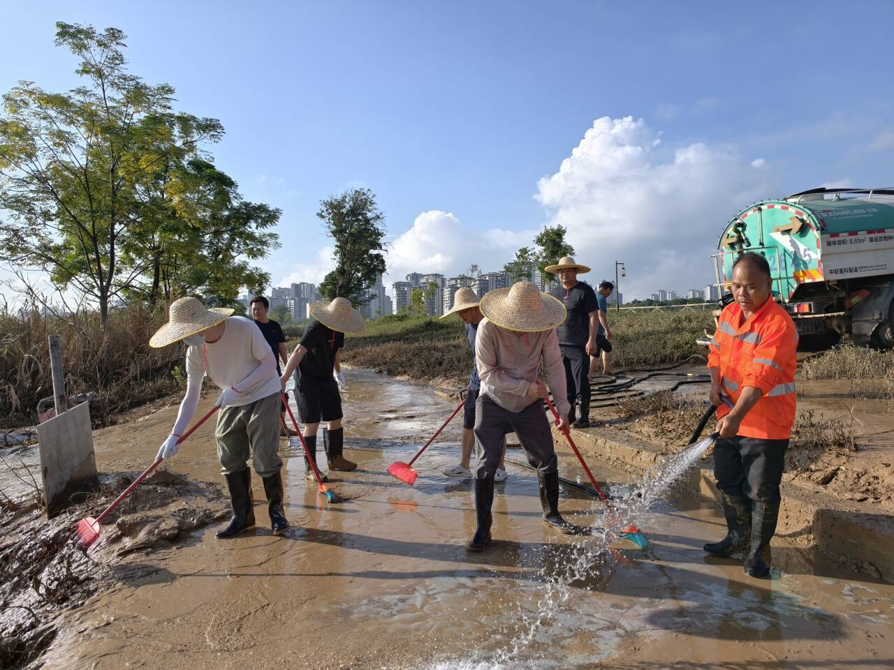 上午8點(diǎn),志愿者們攜帶鐵鏟、刮泥板、掃帚、垃圾袋等工具,準(zhǔn)時在指定區(qū)域集合?,F(xiàn)場的淤泥最深處達(dá)10余厘米,腳一踩便陷進(jìn)去難以拔出,鏟子剛插進(jìn)泥里就被牢牢黏住?!按蠹曳止じ?,先刮表層泥,再清垃圾!” 隨著一聲號召,志愿者們迅速分組行動:有的彎腰緊握刮泥板,順著步道紋理反復(fù)刮除黏連的淤泥;有的扛著水管,利用高壓水槍沖刷地面;有的拎著垃圾袋,蹲下身細(xì)致?lián)焓安卦诓菘p里的垃圾;有的則推著清運(yùn)車,來回穿梭將裝滿淤泥和垃圾的袋子及時運(yùn)離現(xiàn)場…… 各個環(huán)節(jié)銜接緊密、井然有序。盡管天氣炎熱,汗水順著臉頰滑落、浸透衣衫,志愿者們的熱情與干勁絲毫未減,充分展現(xiàn)了國企的責(zé)任與擔(dān)當(dāng)。